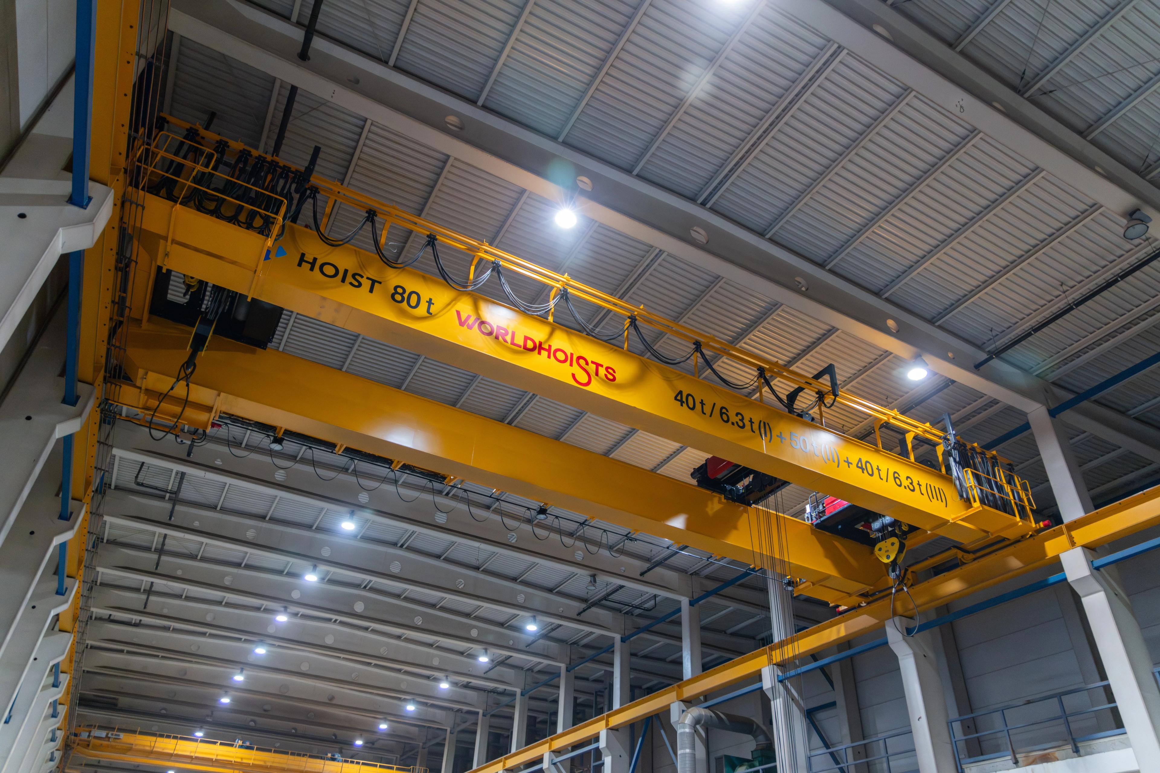 Для выполнения всех данных задач, компания «ХОИСТ» предложила нестандартное инженерное решение — мостовой двухбалочный кран WORLDHOISTS грузоподъемностью 80 тонн, оснащенный тремя грузовыми тележками.